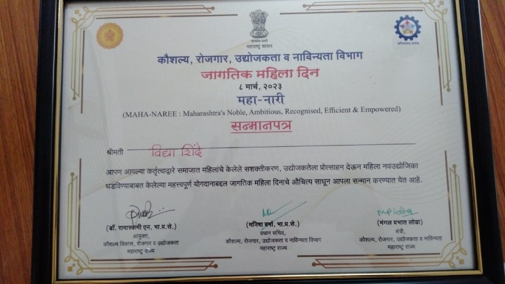 On the occasion of International Women’s Day ,on 8Th March 2024 ,the organization was awarded by the Hon’ble Governer Shri Ramesh Bais under the department of Skill,Employment ,Enterpreneurship and Innovation,Maharashtra State.
